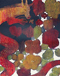 左:服部美法「上昇気流に乗って」アクリル・ステンシル技法 中:伊藤香奈「ちいさな幸運」アクリルF0号