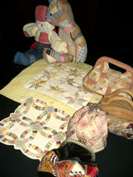 右:野田真美 パッチワーク・ミニタペストリー と 古布の人形、バッグいろいろ