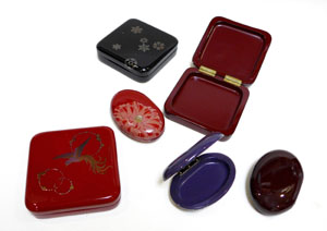 薬入 隅丸角 瑞鳥(朱) 9,0×9,0×高2,5cm 薬入 小判無地(紫)、(茶) 5,0×8,0×高2,2cm