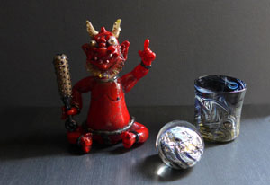「赤鬼」巾13,5×奥8,5×高21,0cm 「ペーパーウェイト」径7,0cm 「グラス」径8,6×高9,3cm
