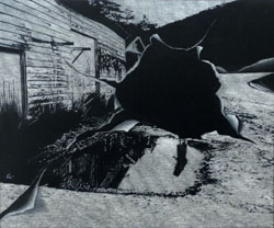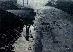 面から針で光を削り出す独特の画法。 白と黒だけの世界は、より強く 過去を刻む。