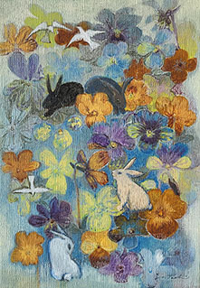 たち ようこ 展 Tempera+Watercolor 2022.4/14(木)~24(日) 10:00-18:00<最終日6:00迄>月・火曜休み 庭に咲く花、身近な風景のなかの動物たち。小さなキャンバスに描き込めました。 Tempera+Watercolorと銅版画、ぬいぐるみ合わせて約60点を展覧します。 「兎たちⅠ」22,8×15,8cm Egg tempera on canvas 1985 多摩美術大学染織デザイン科卒業 1989 山画廊で個展(9回開催)