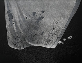 黒と白の世界をキャンバスに描き続けている。 布に映る花影の作品は、
