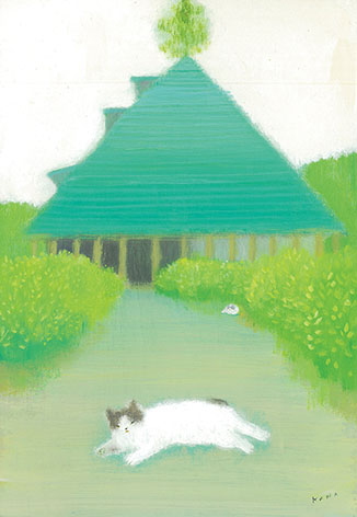 国内外を旅する伊藤香奈さんが描く風景画。 花や木々の中に鳥や動物達が、かくれんぼ。