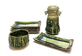 「織部茶碗」径12cm×高8cm 「織部組 長皿」5枚組 1枚11,5×24×高3,5cm 「織部花入」径13×高23cm