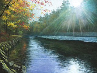 澄んだ空、眩い光、透明感溢れる水の流れさえパステルで描く。