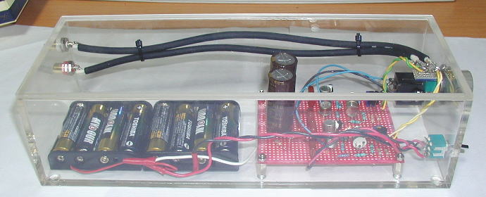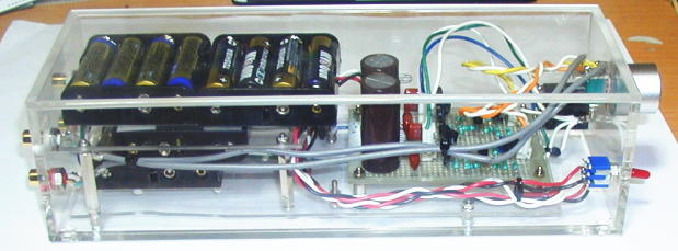 コンストラクション 自作アンプの部品でお金がかかるもののひとつにケースがあります。パワーアンプではトランスと電解コンデンサ、放熱器あたりもお金がかかりますが、これらはないわけにはいきません。しかしケースは直接音に関わるものではありませんからこれを何とかしたい、という気持ちがありました。 家族の買い物につき合っていて丁度良さそうなアクリルの名刺ケースが見つかりました。値段は800円。4mm厚のアクリル板を使っていますので強度的にも問題はないと思います。 アクリルケースを使用するメリットと兎に角安くあげるコンセプトから、プリアンプは電池駆動としました。音の鮮度を優先して結局乾電池は計16本を使い、±12Vで使っています。電圧を変えて調整してみると7〜8Vあたりから音の出方が変わり、押し出しとDレンジが違ってきます。結局電池ケースのひとつは逆さまというアクロバティックな配置になってしまいました。 このアンプは通常のプリアンプとして使用する他にヘッドフォンアンプとしても使えるようなっています。と言うのは、悲しいことに我が家はスピーカーを気兼ねなく鳴らす環境になく、ほとんどヘッドフォンにお世話になっている現状だからです。通常はヘッドフォンアンプとして、たまの休みに小スピーカーでこぢんまり鳴らすという、いかにも小市民的な使い方が前提です。 実はこうした悲しい状況は子供が出来てから顕著になり、今ではヘッドフォンアンプを2台使っています。これが3代目です。1台はチャンネルディヴァイダーに組み込んだトランス式の小出力パワーアンプで、外部入力をプリアンプで切り替えて聴く時に使っています。もう1台は専用のCDプレーヤーからアンプを介し、直接ヘッドフォンを駆動するもので、回路の基本はMJ誌95年6月の金田式プリアンプのものですが手持ちの部品の関係から若干アレンジしてあります。(写真上のアンプ) 今回のプリアンプはこれとほぼ同じ回路で作りました。ただし今回は原回路のNFB内のボリュームを止め、通常の入力側に入れました。というのは原回路ではゲインが大きすぎて通常聴くレベルに調整できないからです。 出力は32Ωで400〜500mW程度でしょう。ヘッドフォンアンプは大体100mW位あれば十分だそうですから問題はないでしょう。ゲインは32Ωで6-8dB程度かと思います。DCドリフトは±2mVでほぼ安定しています。 ![]() アクリル箱の加工 さて、このアクリルケースに基板等を入れるとなると、通常のように底板に直接取り付けるというわけにはいかなくなります。というのは箱にすっぽり納める形になりますので、半田付けや調整等が非常に難しくなります。そこで、アクリルのサブシャーシにある程度組んでしまってから最後にケースに組み込む手順とします。入出力はコネクタを使いました。 基板用のパーツの入手と、フロントの位置決めがうまくいけば、下のシャーシをフロントぎりぎりまで出してヘッドフォンジャックとパワースイッチを基板に乗せることが出来(勿論この場合、基板用のパーツでなければならない)、ワイヤリングを少なくできます。メーカー製では迷わずこの形になるでしょう。ワイヤリングなど製造過程で手間がかかる作業をなるべく避ける設計をするからです。今回は手間を惜しむ必要はないのですが、何しろ狭いケースですから、ケースに収めた後の作業をなるべく避けたいのが本音ですけれどこれは部品が入手できませんでした。 アクリルの加工は今回初めてでした。実際アクリルを切断したり加工するのはかなり面倒な作業です。切断はカッターで切れ目を入れて折るのですが、普通のカッターではなかなかうまくいかない。専用のカッターが必要です。また、ドリルで穴を空けるにも金工用のドリル刃では引っかかりが良すぎてアクリルが欠けることがあります。実際8mm径の穴を空けようとして引っかかりケースが割れた・・・。結局使い古しの切れ味の落ちた刃がよいようです。 ケースの中はアクリルのシャーシを2階建てにします。ひとつは上段の電池ケースを乗せるシャーシ、もうひとつはアンプ基板のためのシャーシです。アクリル板はどこのホームセンターでも容易に手に入る2mm厚のもの。 電池ケース 内部が透けて見えるスケルトンとなると、出来れば市販の電池ケースを使いたくはありません。そもそも電池のケースなどは選べるほど品種がありませんし、まして見栄えを気にしてデザインされた物などありませんから。と言うことで、アクリルで工作して、厚めの両面テープと銅箔で接点を作りましたが非常に不安定。しかし金田式高音質の手段、半田付けという荒技はこの場合使えません。市販の電池ケースの接点を見てみると、プラスチックに金属プレートをかしめてあるだけですから、転用は無理そう。仕方なく普通の電池ケースに落ち着いてしまいました。出来ればお金をかけないでここをなんとかしたいですね。 ツマミ、スイッチ等 アンプのパー