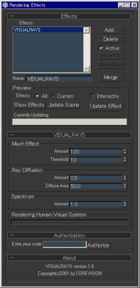| "VISUALRAYS" is a scripted RenderEffect plugin for 3dsmax4. Very realistic renderings will be created with VISUALRAYS. Although it's a very simple plugin, our advanced algorithm simulates human visual systems to render realistic images. Check the following sample renderings! Original 3dsmax4 rendering  Rendering with VISUALRAYS rendereffect  | VISUALRAYS for 3dsmax4.x Price :US$195 ( Special reduced promotional price ! )  | |||||||||