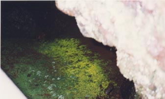 左の写真はマッカウス洞窟に生えている、ヒカリゴケの写真です。