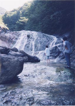 | 「まだつかないのか」と呆然と立ちつくす、俺とN。 目の前の滝も登って行きます。 服はびしょびしょです。 ちなみに右側の靴を履いている方が俺です。 |