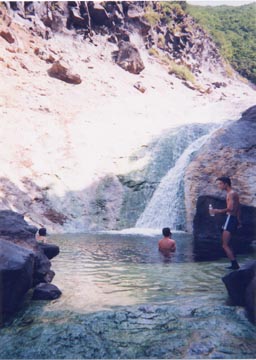 ここが滝壺兼湯船。 唯一人、水着を持参していたMによると、 滝壺になっている部分は、結構な深さがあり、 引き込まれそうなぐらいだそうだ。 いや、本当に疲れました。 双爆台、松山湿原に匹敵する疲れだ。 |