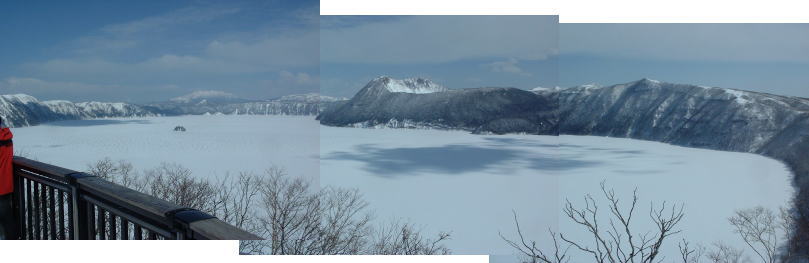 冬の摩周湖の全景。暖かかったので樹氷はありませんでしたが、摩周湖は凍り付いています。湖面の黒い陰は雲です。
