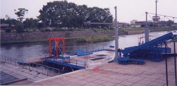 この写真の紅い鉄柱で囲まれた部分に水車があり、その水車で鮭を捕まえる・・・・らしい。