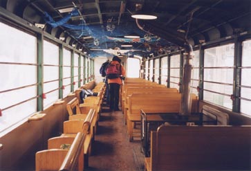 上の右はノロッコ号車内で、左が車内にあるダルマストーブ。
