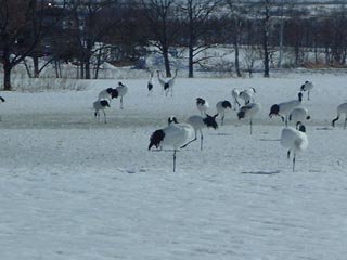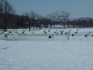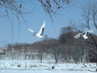 定期観光バス「ホワイトピリカ」で行った鶴見台にて 上の左の写真をアップにしただけの右の写真。 周りにもたくさんいるのだ。 ガイドさんによると合計70羽ぐらいいたらしい。 左は今回の旅行(流氷一人旅)のベストショットかな? カメラをかまえたらちょうどこっちに向かって飛んできた。 偶然の産物・・・・。 鶴見台はもともと、一人のおばあさんが自腹で餌付けを していた場所。 今では国の丹頂保護政策により、餌代は国家予算。 |
