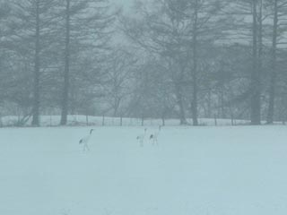 | 「SL冬の湿原号」に乗っているときに茅沼駅に現れたタンチョウヅル。車内から撮ったのでちょっと見づらいです。 この3羽は親子かな? 釧網本線の茅沼駅は、昔有人駅だった頃に歴代の駅長さんが餌付けしていて、 その名残でここに鶴がやってくるそうです。タンチョウヅルの観察ポイントとしてかなり有名ですよね。 |