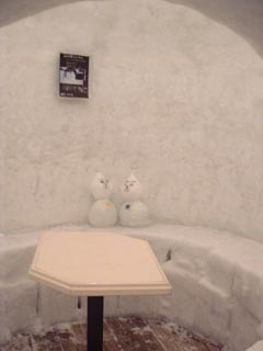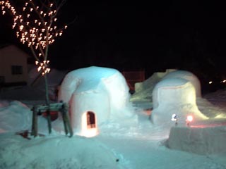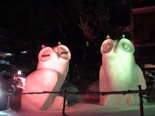 こちらは第二会場。 これ以外にもかまくらや雪だるまがたくさんいます。 場所的には黒岳の湯の裏側付近。 上のかまくら、うまく写真が撮れてなかった・・・・。 左はかまくらの中にいた、雪だるま君。 ここは隣にあったお店がやっているのか、 メニューがおいてあった。 |