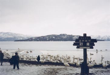 冬と夏の砂湯。 地面が熱く、掘ると温泉が出てくる。 その為に冬でもこのあたりの湖岸は 凍結しないので、白鳥の楽園に。 夏にも桟橋に白鳥??がいますけどね。 |