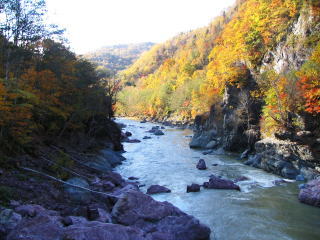 R237の占冠の交差点からD136へ入り、5kmぐらい。 途中からダート。 駐車場はありません。道路わきのスペースに3台くらいかな。 珍しい赤い岩のある風景。 周りには紅葉や黄葉する木がたくさんあるので、 秋には色とりどりの風景を楽しむことができます。