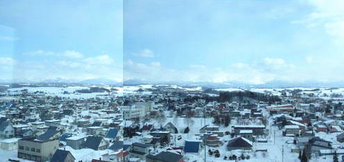 美瑛駅前 美瑛町役場にある、高い塔。 塔の上からは美瑛の町並みと十勝連峰を見ることが出来る。 役場にある建物なので、上の展望台は少し狭いです。 ・・・・・高いところは恐いです・・・窓に近づけなかった・・・。