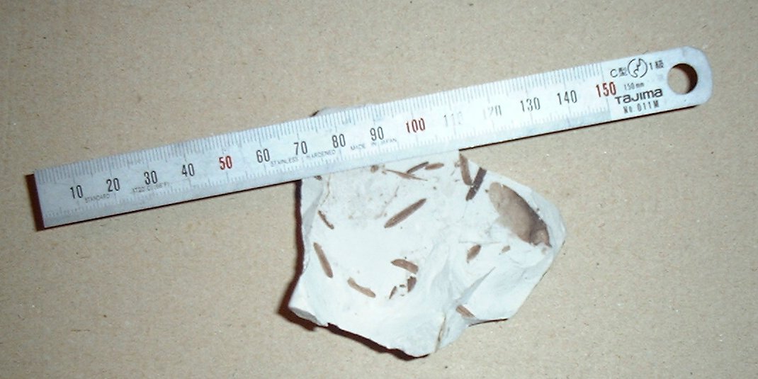 神戸層群の化石は葉の化石だけでなく、木の枝、種子などがたくさん見つかります。カエデの翼果やどんぐりなども葉の化石に混ざって産出します。葉の化石に比べて、小さいので、見落とさないように注意していると、よく見出されます。