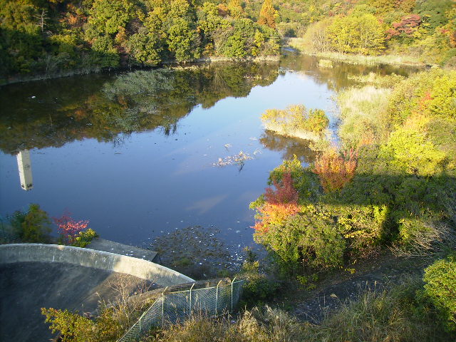 落合池凝灰岩層 神戸市営地下鉄の名谷駅を下りて、北側に出て、陸橋を渡っていくと、落合池が見える。初期の神戸層群の研究もこの地域で行われた。現在は写真のように落合池を残し、まわりは住宅街となっている。かつての面影はまったくない。 当時は山陽電鉄板宿駅を降り、市バスで妙法寺まで乗り、そこから歩いて落合池まで行くというルートで、行くのもたいへんだった。化石はいっぱい含まれているというより、散在して含まれる。