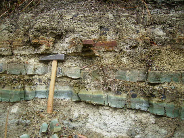 写真では3枚のうちの上位1枚はやや不明瞭であるが、このように見られことが多い。切り通しでは明瞭に観察される。化石採集では、植物化石だけに目をとられやすいが、凝灰岩の特徴を調べておくことで、層準を把握する鍵にもなるといえる。