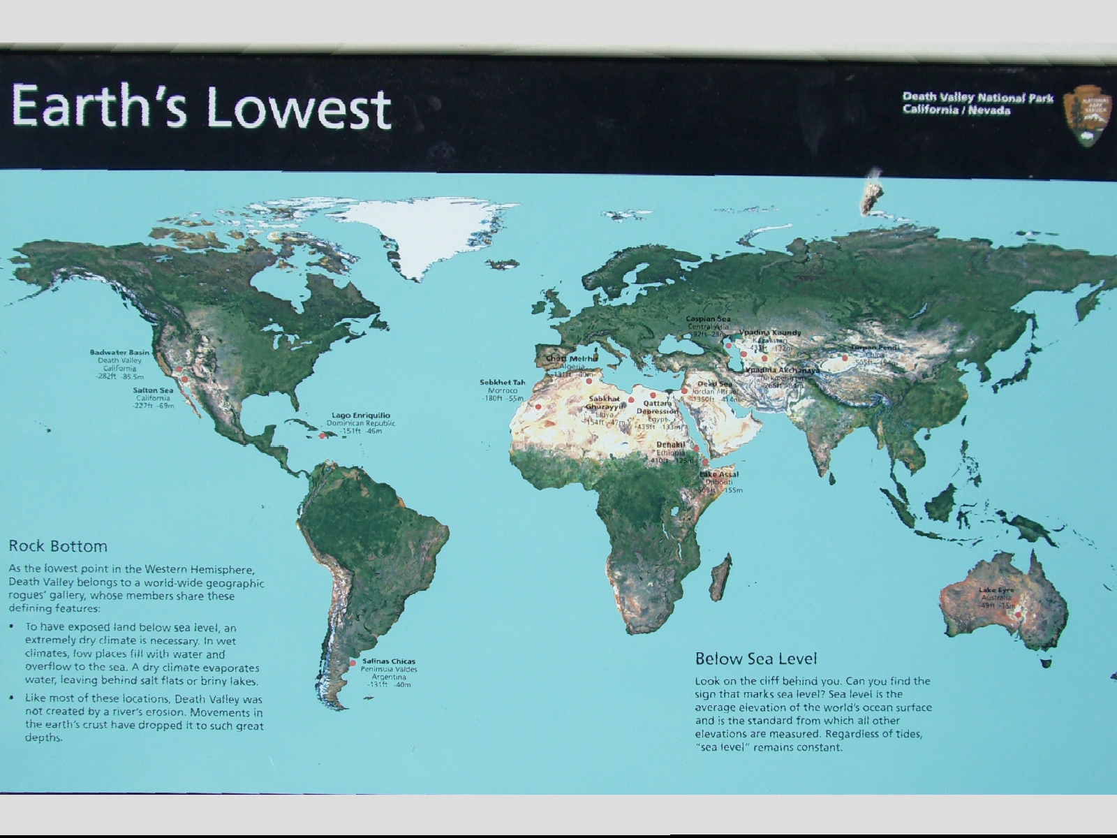 西側の渓谷。 砂漠。 Salt Creek。 Museum。 Golden Canyon。 先に進むと。 道脇を登ってみた。 意外といい景色。 これが脇道。 Devils Golf Course。 Bad Water。 山の中腹が海水位。 世界の低地。クリックで大きく Artist pallet。 いろんな風景がある。 ココは綺麗だ。