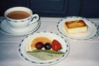 サラダ(ドレッシングはキュウリクリームビネガーかユズ)、チキンのカレーソース掛け、付け合わせはパプリカのグラッセにライス、パンは数種から選択。私はお気に入りのガーリックバタートーストを。デザートはパインケーキ、フルーツ盛り合わせ、コーヒーか紅茶。