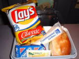 デンパ→グアムはYだったので、軽食(本当に粗食だ・・・スナックとサンドウィッチ)に安いワイン。悲しいなぁ・・・。でも、その後は死んだように?寝てしまったわ。