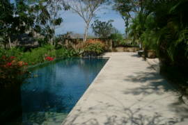 ここに到着した時とはうって変わり、プールサイドには花を盛った籠が並び、行進していく道には香りの良い葉が敷き詰められていました。庭の中央にあるリビングスペース?には、プールに向かい合うように二つの椅子が並べられていて、ここが私達の席。腰を下ろすと、ガムランの音が一層激しさを増し、ウエルカムダンスの始まりを告げます。