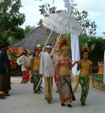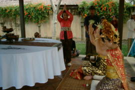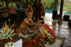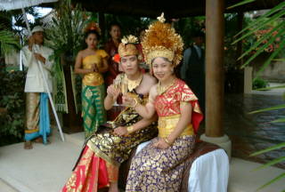 バリニーズにとって、結婚式は神聖な儀式のひとつのはず。それなのに、私達のような異教徒(と言えるのかな? 無宗教、というべき?)である外国人がひょいと訪れて、式の真似事をする。これは神々への冒涜にならないだろうか、と心配でもあったのです。ところが、式に立ち会ってくれた人達は、私達を笑顔で迎え、式の最中の失敗も、明るく笑い飛ばしてくれました。(もちろん、外国人だから仕方ない、という思いもあることでしょうが。)そんな彼らに心から感謝します。…ますます、この島が好きになリました。本当にありがとう。