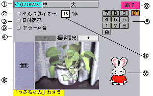 ただし、@画面サイズで「大(VGA)」はありません。A露光調節は本体の ボタンからのみで画面上のボタンではできません。Bうさちゃん目覚しとの 連動で/s3は/s2と同じに扱われます。