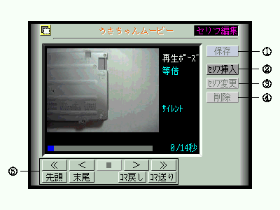 - <<(早戻し)、<(逆再生)、>(再生)、>>(早送り)、先頭、末尾、コマ戻し、