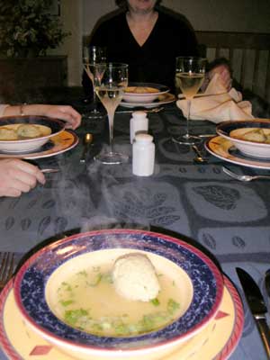 午後四時頃おじゃまし、まずオードブルでビール。 それから少し散歩して、 6時ごろからディナー 写真は撮らなかったが、 この前に、アボガド半割の前菜があった。 写真は、練り物に近い味がする 団子のはいったスープ。薄味で美味しい。 スープはフォーマルな食事で欠かせないらしい。 |