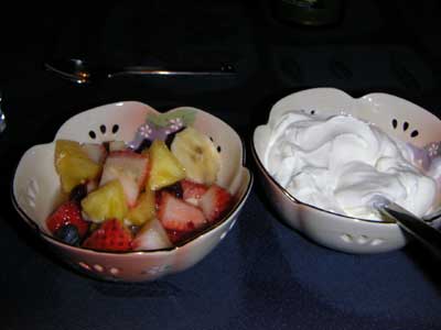 | フルーツとヨーグルト ヨーグルトはギリシャ産で濃厚な味 お腹いっぱいの私には少々きつかった 器は日本製? |