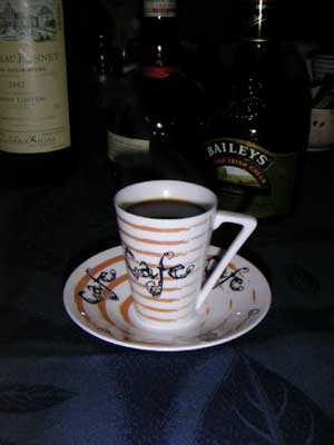 超濃いエスプレッソ 盃ほどの小さいカップですが 少しずつしか飲めません。 胃を荒らさないためにそれでいいそうです。 |