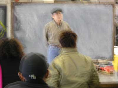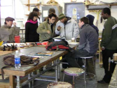午前10時半のアポイント、Platt Instituteへ徒歩で行く。宿から20分ぐらい、日本の真冬みたいに風が冷たい。思ったより広いキャンパス、生徒さんたちに聞いたりして、大舘さんが、教えておられる教室へ入る。アシスタントの日本人青年が椅子を用意してくれ、10人ぐらいの生徒さん達といっしょに、大舘先生の講義を聞く。先生の著書を参考にしながら、黒板で、日本では決して講義で登場しないような、繊細な研ぎの話をされる。糸裏の重要性、鉋マクラをなくすために刃をほんのわずかに中高にする方法と、刃を回してそれを確かめる方法、刃を叩いて裏出しをすることの重要性、ノミは叩かずに刃先の方だけに力を入れて、最後までベタ裏ではなく使う方法等々、職人が体で修得したことを、黒板で知識として与えておられる。生徒がこれを本当に理解できるとは思えないが、日本の「見て覚えろ!」式に比べ、こういう講義も大切ではないかと感じた。火曜日だけ、ブルックリンのこの学校まで来て教えておられるとのこと。その後、お昼をご馳走になりながら、今までの経緯や日本の刃物についての多岐にわたるお話を伺った。