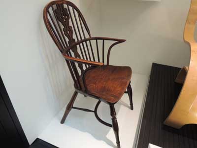 イギリスと言えばウィンザーチェアですが、古いオリジナルに近い形を知ることができます。かなり前に小国木材加工研究所で行われた製作講習会で聞いたとおり、脚は通しホゾではないのが本来の形のようです。弓形のストレッチャーの形も同様です。右はトーネットの曲木椅子ですが、接合にかなりダボが使われています。