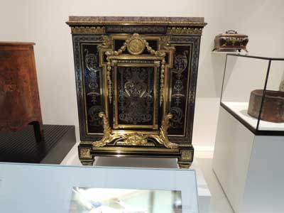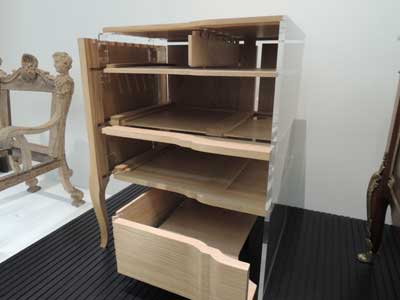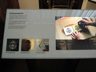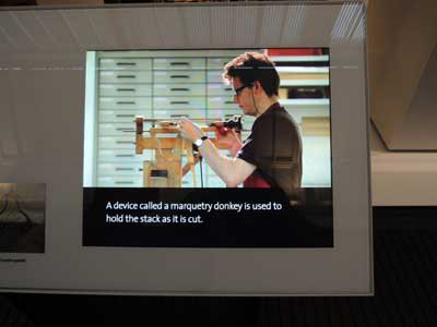 左はキャビネットの構造をわかりやすく分解展示したもの。桟や抽斗を受ける構造、また裏板の取り付け方法など参考になります。右は象嵌の美しいキャビネットですが、この技法について、タッチパネルで詳しく解説がしてあります。