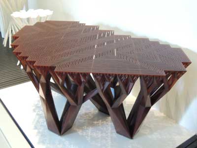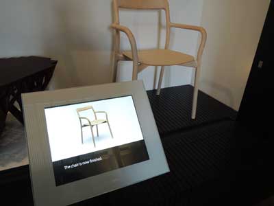 左の椅子は、部材加工の多くの過程をコンピューター制御の木工機械で行われています。正直なところ、「ここまでやるか!?」と驚いてしまい、小さな木工屋が必死で木を削っていてよいのだろうかと疑問も感じてしまいました。ただ、なんとなくツルンとした無機質な感じは機械加工だからかもしれません。右の樹脂製テーブルは、木をモチーフにしたアイデアからコンピュータープログラムにより枝分かれした立体図を作成、それを3次元プリンターでしょうか、ビデオではよくわからないのですが、レーザーで位置決めをしながら、すべて機械で製作されています。このプロセスもネット場に公開されています。クラフトの領域でも、近い将来このような制作方法が主流になるのかもしれません。