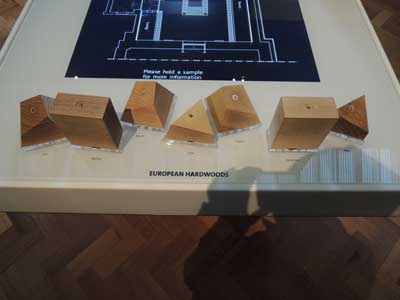 左の木のブロックは、様々な種類の木で、それをさわると、その樹種に応じた説明が表示されます。右のU字型のベンチは、休憩用と思われるコーナーに設置してあり、この展示場に相応しいユニークなベンチです。