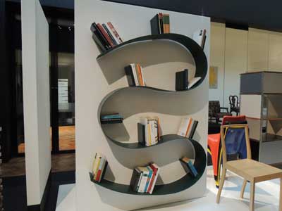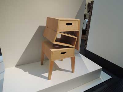 最新のデザインがユニークな家具も多数展示されています。左の本棚、面白いですね。安易な真似はダメですが、発想の原点は参考になるように思います。右のキャビネット、机にも変身できるのです。これはTomoko Azumiさんというロンドンで活躍されている日本人デザイナーの作でした。