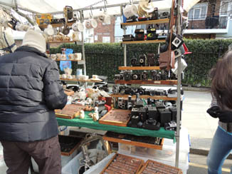 アンティークカメラの露店とポートベローのストリートマーケット。