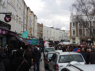 以前来た時も、ポートベローに来ているが、マーケット開催日ではなかったので、今回はぜひ開催日の土曜日に行ってみたかった。地下鉄ノッティング・ヒル・ゲート駅から案内看板の方向に歩く。沢山の人が行くので迷わない。住宅街と思われる地域に入ると道の両側に露店が並んでいる。早朝だったので、まだ回転準備中のテントも多い。アンティークマーケットとして有名だが、場所によって食べ物があったり、服があったり、実にバラエティーに富んでいて、フリーマーケットのようなのが1km以上も続く。とにかく端まで歩いてみて、あとゆっくりと店を見ながら引き返す。帰りは露店だけではなく、通りにあるアンティークの店にも入ってみた。人通りの少ない平日だとビルの奥まで入って小さな店々を見るのは躊躇われるかもしれない。マーケット開催日は人がごったがえしているので、スリに気をつける必要はあるが、どんどんいろんな店に入っていける。怪しい品物も多くあって掘り出し物を見つけることは困難だと思うが、英国のアンティーク文化を知るには大変よい経験ができた。