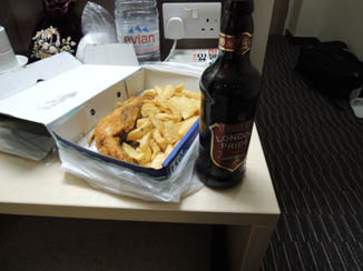 コベントガーデン近くにフィッシュアンドチップスで有名な店があるというので行ってみたら、小さく狭い店に人が大勢並んでいた。そこで店に入るのはあきらめ、テイクアウトしてホテルで食べることにする。ロンドンプライドというエールビールも買い込み、ホテルの部屋で食べる。まあ単純に魚のフライであり、日本人が好む味だと思う。意外とあっさりしていて、ペロリと平らげた。とにかく今年の3月は記録的な寒さということで、夜は氷点下となり、外へ出る気にならず、早めに寝た。余談だが、ロンドンプライドのビール、なんと近所のジャスコで売っていた。