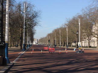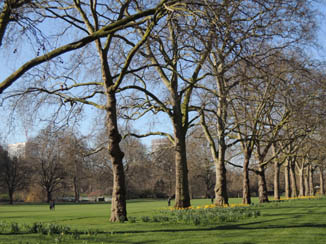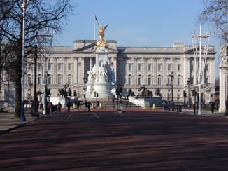 バッキンガム宮殿では衛兵の交代式が有名。宮殿前の静かな森の散歩を楽しむ。