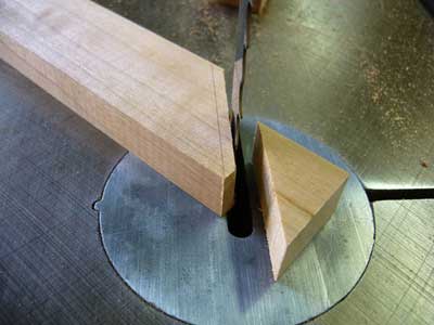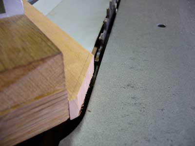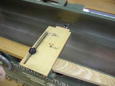 丸鋸盤のフェンスは材との摩擦を防ぐ意味でほんのわずか(50cmで0.5mmほど)先に向かって広げてセッティングしてあります。また、日本製の丸鋸盤では鋸刃といっしょに高さが変化できるような割り刃が備わっていないため、材を送る最後の方でコントロールが難しいのです。溝つき加工の失敗の多くは、送材後半のコントロールの甘さによるものです。それに対処して、フェンスに材を押さえつけるようなジグを使うことは、鋸刃との摩擦などの関係を充分に理解していないと、返って危険なこともあると考えています。