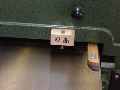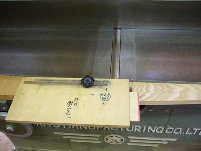 自動鉋は、材が手前に飛んだ場合、最も大きな事故になる可能性があります。このため、運転中は、刃の手前は立ち入り禁止にしています。また、最初の高さ調節が難しいので、写真のように、刃と同じ高さの上下可能なボルトを差したゲージを両面テープで貼り付けています。このボルトがわずかに動くぐらいにセットして材を送ると、ほとんどうまくいきます。