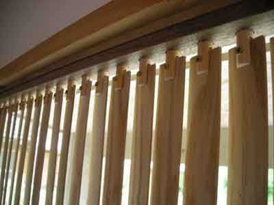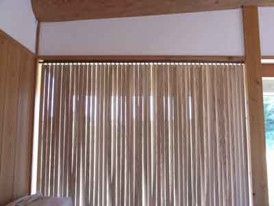 木製バーチカルブラインド 工房入り口のギャラリーを図書室兼用とすべく、遮光用に作成。前回作った右側は柾目、今回のは板目のタモ材。 |